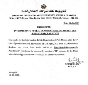 ఆంధ్రప్రదేశ్లో ఇంటర్మీడియట్ విద్యార్థులకు అలర్ట్. ఇంటర్మీడియట్ (AP Inter 2025) మొదటి సంవత్సరం, సెకండర్ ఇయర్ ఫలితాలు ఏప్రిల్ 12వ తేదీన విడుదల కానున్నాయి. శనివారం ఉదయం 11 గంటలకు ఫలితాలు వెల్లడించనున్నట్లు రాష్ట్ర విద్యాశాఖ మంత్రి నారా లోకేశ్ (Nara Lokesh) ప్రకటించారు. ఇప్పటికే ఇంటర్మీడియట్ మూల్యాంకనం, రీ వెరిఫికేషన్, కంప్యూటరీకరణ ప్రక్రియలన్నీ పూర్తయ్యాయని తెలిపారు.