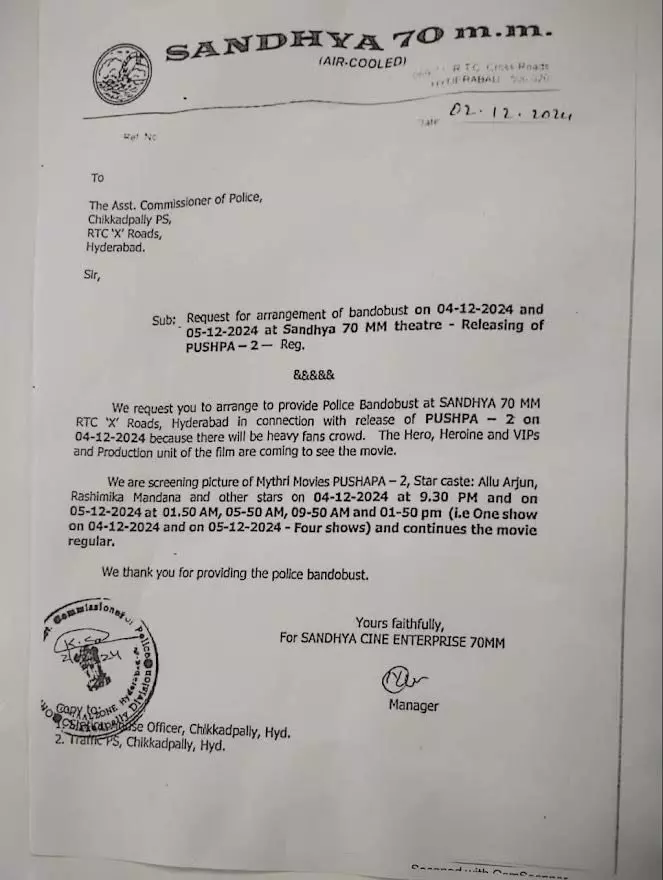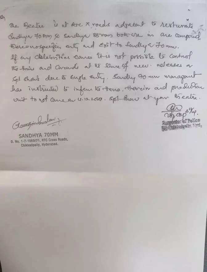 ఈ క్రమంలోనే తాజాగా పుష్ప-2 చిత్ర ప్రీమియర్ షో వ్యవహారంలో మరో ట్విస్టు చోటుచేసుకుంది. పుష్ప-2 నటీనటులు సహా యూనిట్ వస్తున్నట్లు పోలీసులకు తెలుపుతూ సంధ్య థియేటర్ యాజమాన్యం (Sandhya Theatre Incident) లిఖితపూర్వకంగా అనుమతి కోరిన విషయం తెలిసిందే. దీనికి సంబంధించిన అధికారిక లేఖ ఇప్పుడు నెట్టింట వైరల్ అవుతోంది. అయితే థియేటర్కు ఇరువైపులా రెస్టారెంట్లు ఉండటం వల్ల రద్దీ ఎక్కువగా ఉంటుందని పోలీసులు తెలిపినట్లు చిక్కడపల్లి ఇన్స్పెక్టర్ రాసిన లిఖితపూర్వక లేఖ ఒకటి ఇప్పుడు నెట్టింట చక్కర్లు కొడుతోంది.