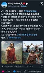 అయితే తాజాగా ఈ వివాదాన్ని పక్కనపెట్టి కన్నప్ప సినిమాపై స్పందించాడు మనోజ్. జూన్ 27న విడుదల కాబోతున్న కన్నప్ప సినిమా కోసం ఆయన స్పెషల్ ట్వీట్ చేశాడు. ఈ సినిమా కోసం తమ నాన్న మోహన్ బాబు గారు, టీమ్ ఎంతగానో కష్టపడిందని పేర్కొంటూ… ‘‘ఈ సినిమా పెద్ద హిట్ కావాలని మనస్ఫూర్తిగా కోరుకుంటున్నాను’’ అంటూ ట్వీట్ చేశాడు.