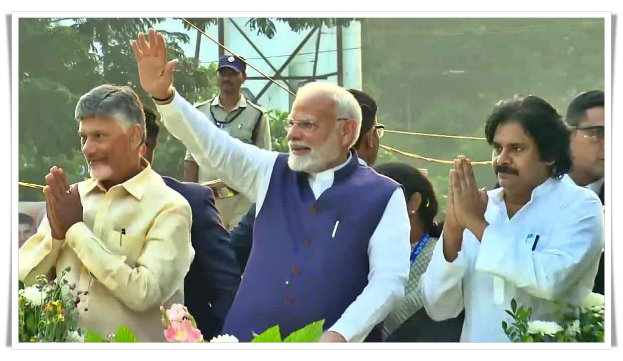 ప్రధాని నరేంద్ర మోదీ (PM Modi) విశాఖకు చేరుకున్నారు. గవర్నర్ నజీర్, సీఎం చంద్రబాబు, పవన్ కల్యాణ్, బీజేపీ నేతలు ఆయనకు ఘన స్వాగతం పలికారు. అనంతరం విమానాశ్రయం నుంచి సిరిపురం కూడలి వద్దకు ప్రధాని మోదీ చేరుకున్నారు. సిరిపురం కూడలి నుంచి ప్రధాని మోదీ రోడ్ షోగా తరలి వస్తున్నారు. దాదాపు లక్షమందితో సిరిపురం కూడలి నుంచి ఏయూ ఇంజినీరింగ్ కాలేజీ మైదానం వరకు ప్రధాని మోదీ రోడ్ షో కొనసాగుతోంది.