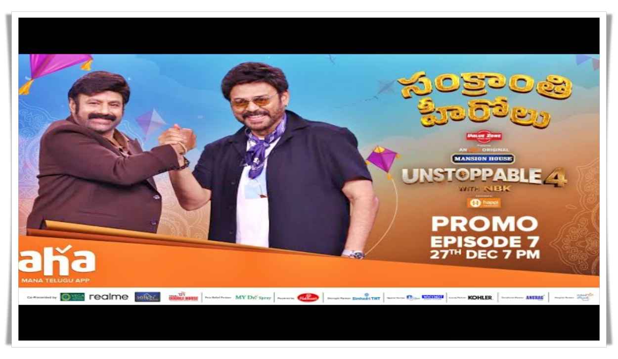 Mana Enadu : ఆహా ఓటీటీ వేదికగా నందమూరి బాలకృష్ణ అన్ స్టాపబుల్ విత్ ఎన్బీకే (Unstoppable with NBK S4) అనే టాక్ షోను హోస్టు చేస్తున్న విషయం తెలిసిందే. ఈ షో ప్రస్తుతం నాలుగో సీజన్ నడుస్తోంది. ప్రతి వారం ఓ గెస్టుతో అలరిస్తున్న ఈ షోలో తాజాగా విక్టరీ వెంకటేశ్ (Venkatesh) సందడి చేశారు. సంక్రాంతి పండుగ స్పెషల్ గా వస్తున్న ఈ ఎపిసోడ్ లో వెంకటేశ్ తో పాటు ఆయన లేటెస్ట్ మూవీ ‘సంక్రాంతికి వస్తున్నాం’ టీమ్ కూడా సందడి చేసింది. సంక్రాంతి హీరోలు అనే టైటిల్ తో వస్తున్న ఈ ఎపిసోడ్ కు సంబంధించిన ప్రోమో రిలీజ్ అయింది.